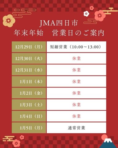 HOME お知らせ お知らせ 2025.12.05 年末年始の営業日のお知らせ 平素は格別のご高配を賜り、 厚くお礼申し上げます。 年末年始の営業日を、 お知らせさせていただきます。 新年は1月5日(月)より通常営業致します。 休業中に頂きましたお問い合わせは、 2026年1月5日(月)以降に 順次返信させていただきます。 来年も変わらぬご愛顧を賜りますよう お願い申し上げます。