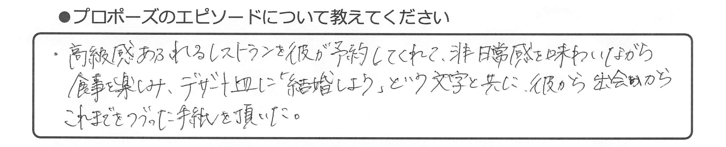 ・高級感あふれるレストランを彼が予約してくれて、非日常感を味わいながら、食事を楽しみ、デザート皿に「結婚しよう」という文字と共に、彼から出会いからこれまでをつづった手紙を頂いた。